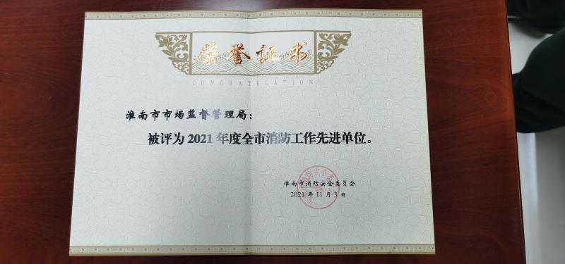 日前,淮南市市場監(jiān)督管理局榮獲2021年度全市消防工作先進單位。