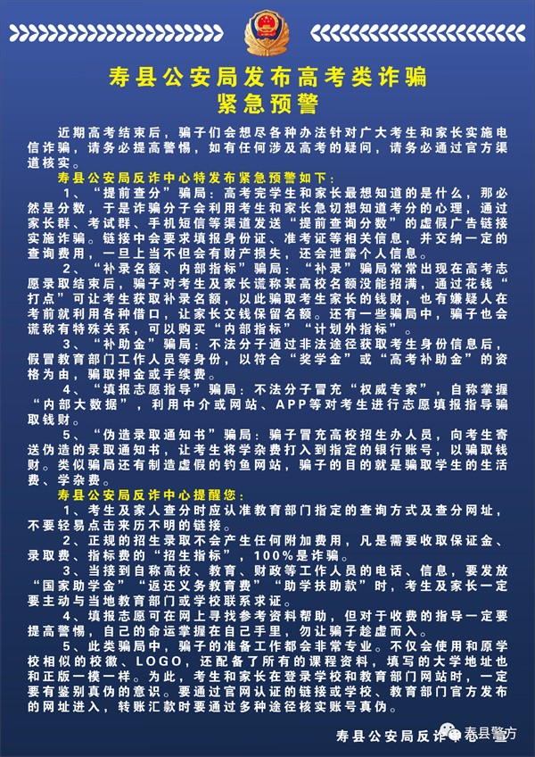 壽縣公安局發(fā)布高考類詐騙緊急預(yù)警