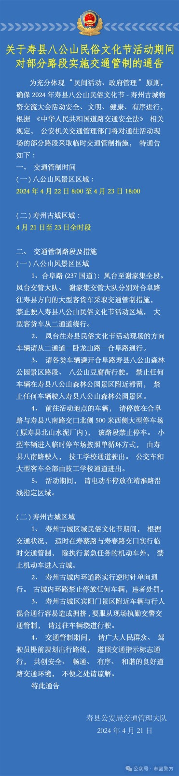 關(guān)于壽縣八公山民俗文化節(jié)活動(dòng)期間對(duì)部分路段實(shí)施交通管制的通告