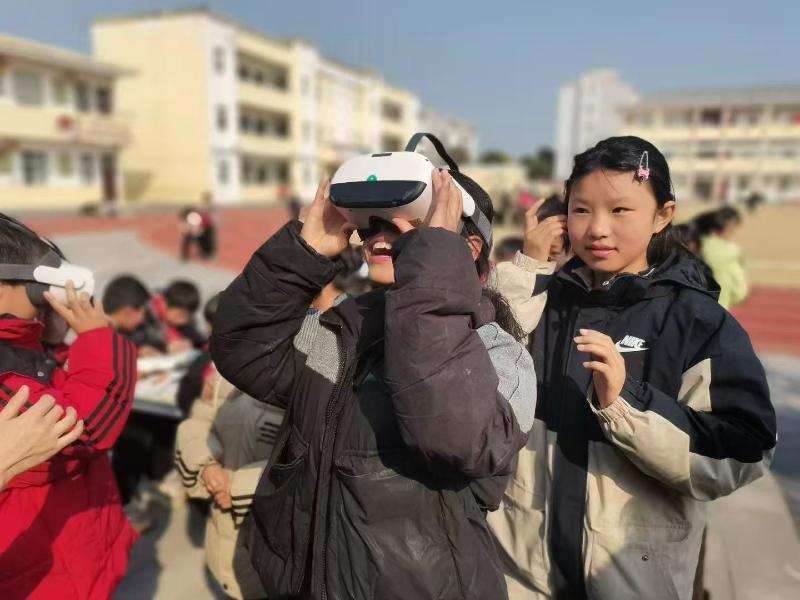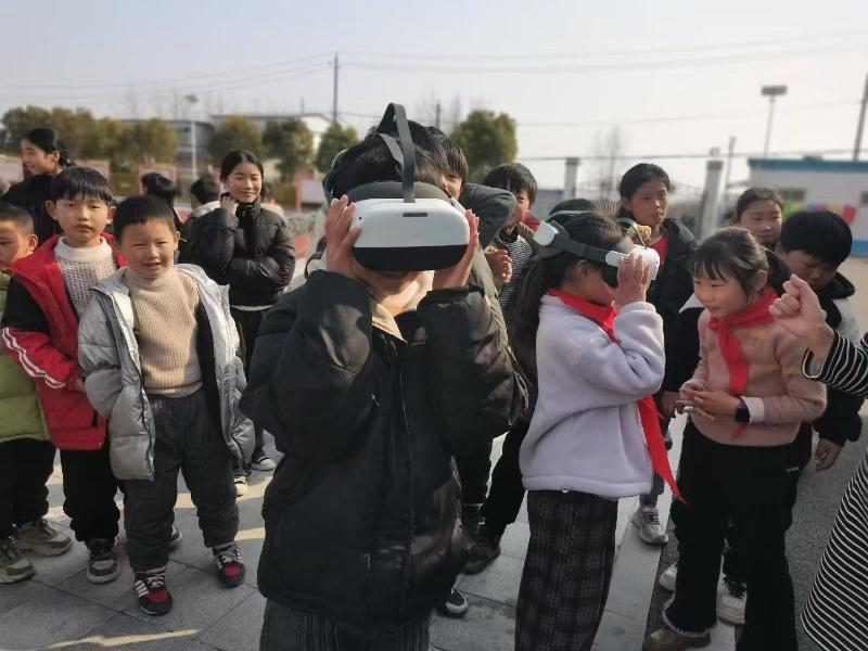 活動當日,滿載著繪本圖書等書籍資源的“閱讀大篷車”駛?cè)肓藟劭h壽春鎮(zhèn)九龍小學(xué),為孩子們帶來了一場豐盛的知識“盛宴”。工作人員們分發(fā)了各類圖文并茂的精美繪本以及科普讀物,引導(dǎo)孩子們在“汽車圖書館”這一新奇閱讀場地中閱讀繪本,討論猜謎,共同徜徉在異彩紛呈的知識世界之中。此外,活動現(xiàn)場還為孩子們提供了VR眼鏡,通過智能化設(shè)備讓孩子們“沉浸式”欣賞體驗了險峻高山、茂密叢林、壯闊深海等自然風景,生動有趣,如臨其境?;顒幼詈螅袌D書館等四家主辦單位共同向九龍小學(xué)師生捐贈了書包、科學(xué)實驗套裝等物品,將溫暖與關(guān)愛繼續(xù)傳遞下去。