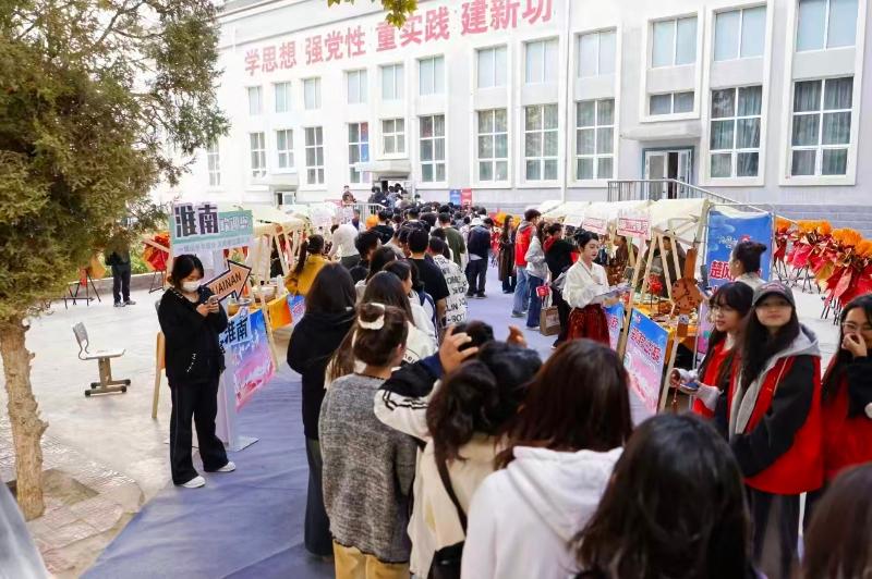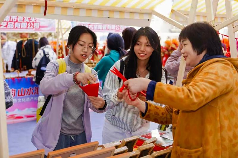 演出同時(shí),9位淮南企業(yè)代表攜帶地方特色產(chǎn)品開展非遺市集展,從淮南特色美食到非遺手工藝品,每件展品均吸引師生駐足。